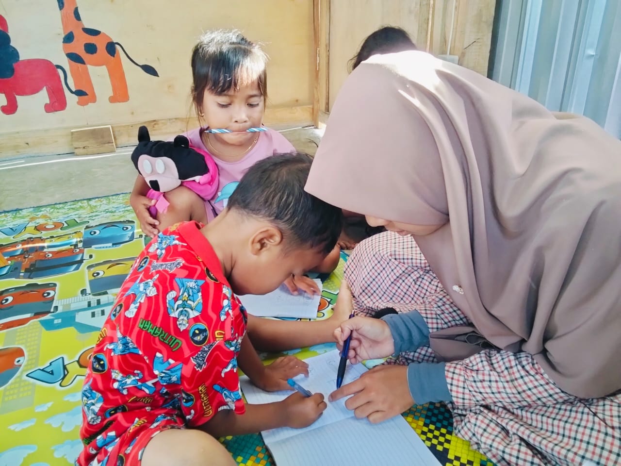 Tak hanya anak-anak, guru pendamping juga turut serta mencoba menenun langsung. Dengan sabar dan penuh antusias, guru menunjukkan cara menganyam benang, sehingga anak-anak melihat bahwa menenun memang membutuhkan ketelitian dan kesabaran â kualitas penting dalam kreativitas.